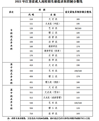 江蘇省2022年成人高考最低錄取控制分數線公布