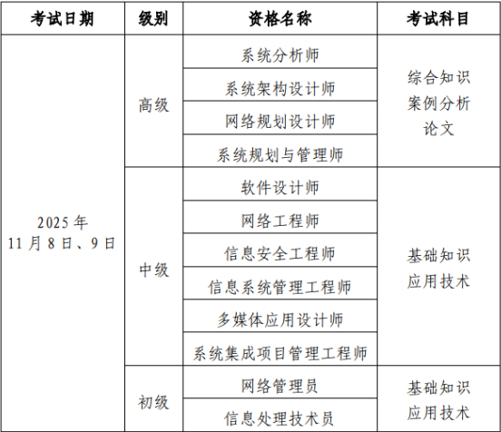 2025年下半年計算機軟件資格考試設(shè)置初、中、高三個級別,各級別資格名稱及考試科目見下表: